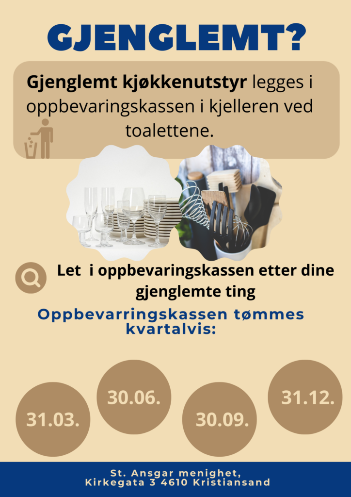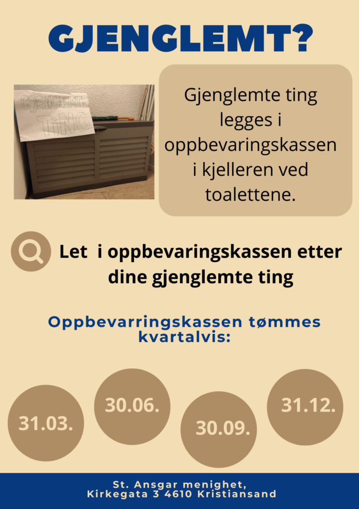 • Oppbevaring: Gjenglemte gjenstander vil bli oppbevart i tre måneder i kjelleren i kirken, i en oppbevaringskasse ved handicaptoalettet. Etter tre måneder blir alle gjenglemte gjenstander kastet.